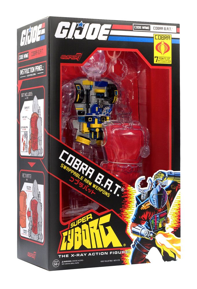 Doctor Mindbender's creation, the Cobra Battle Android Trooper (B.A.T.) as you've never seen it before! Along with seven points of articulation, the Super Cyborg Cobra B.A.T. action figure stands 11" tall and features a clear exterior so you can see ALL of the inner workings. Your figure will come with a gripper claw, laser cannon, and flamethrower accessories, and will be a fearsome addition to your G.I. Joe collection!