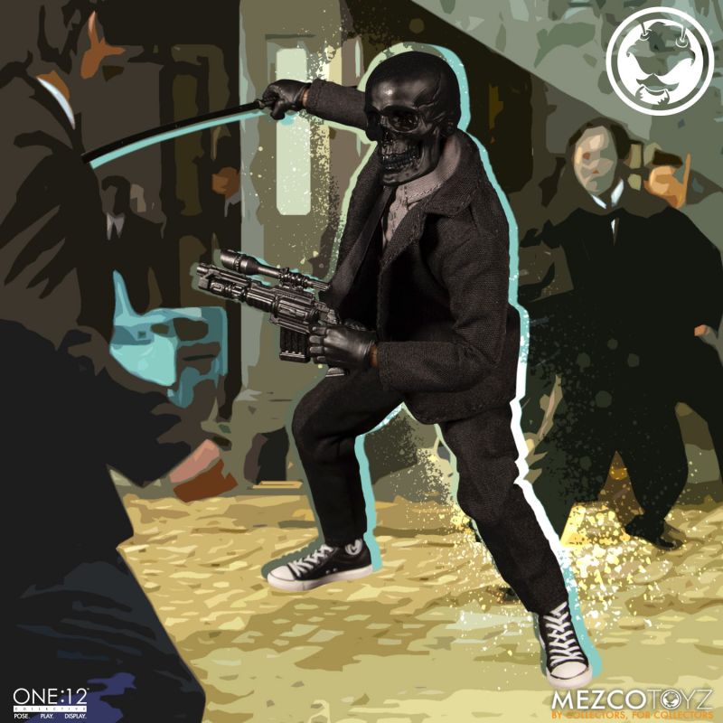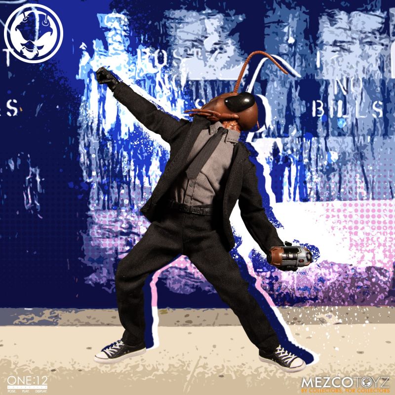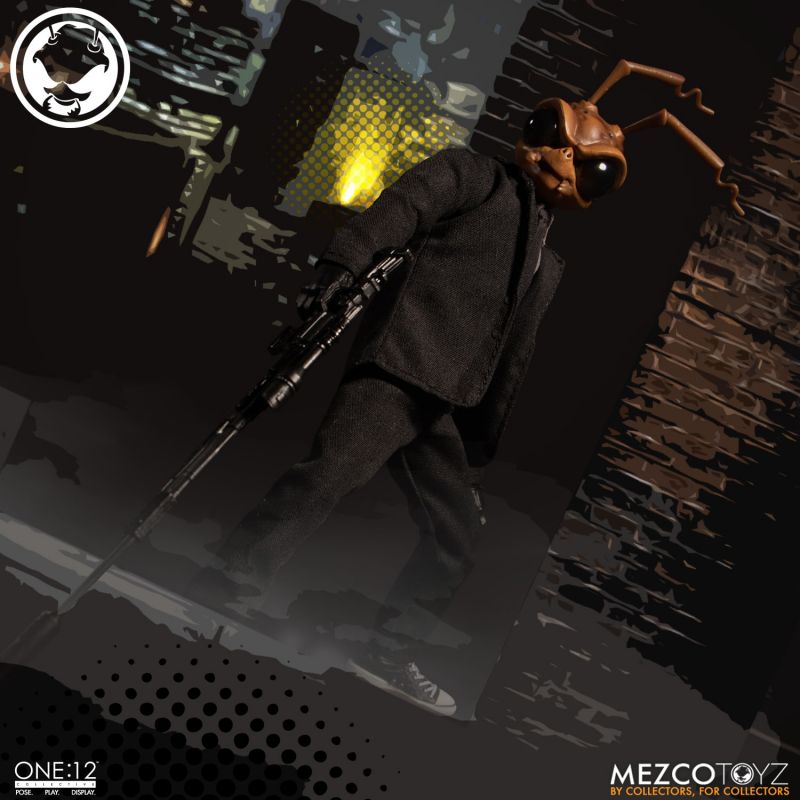Dapper in his 2-piece suit, the Mezco Toyz mascot comes with a removable trench coat with an integrated posing wire in the belt. If that wasn’t enough, Gomez includes three interchangeable heads: his classic look, an updated modern look, a roach head, and a skull because skulls are always fun!