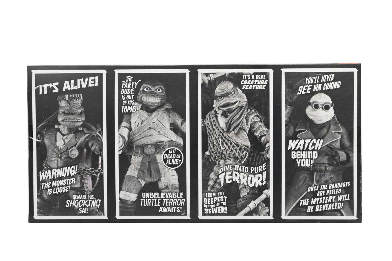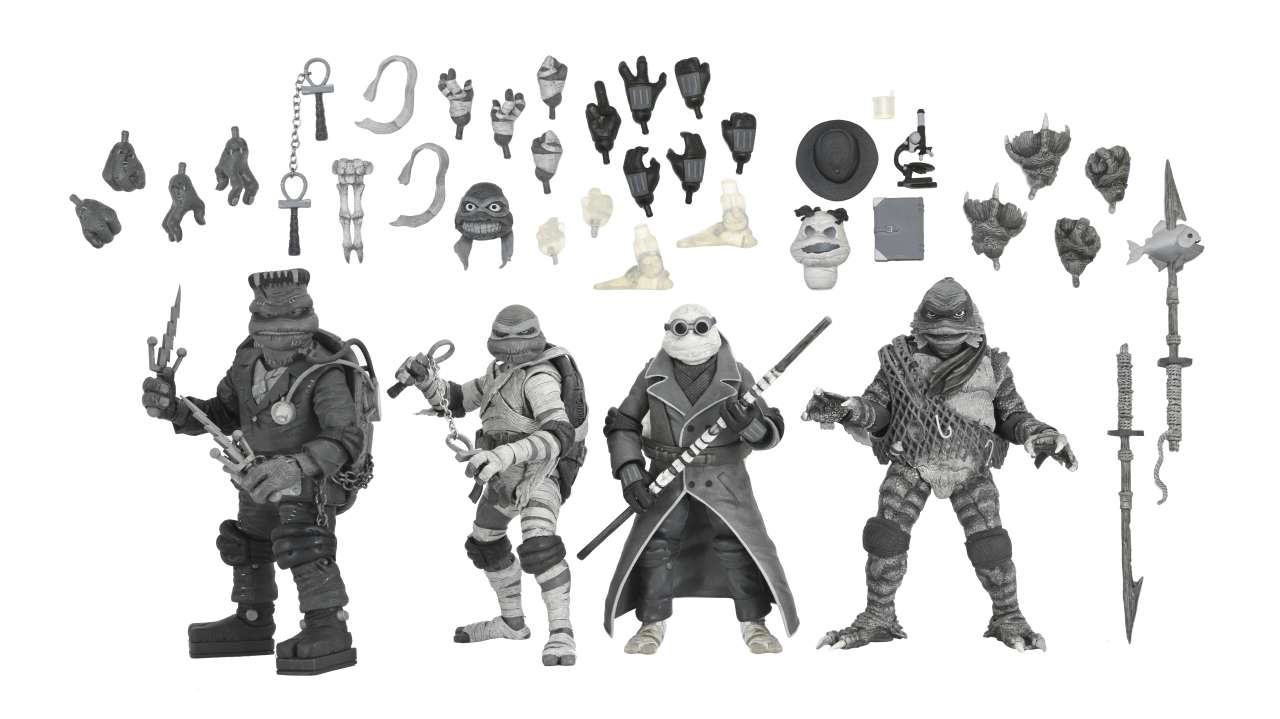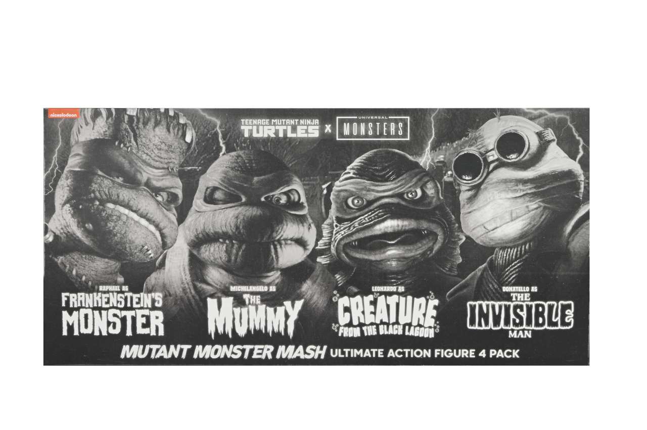 NECA is thrilled and chilled to introduce the next release in our Universal Monsters x Teenage Mutant Ninja Turtles action figure line! Paying tribute to the world’s most famous turtles and Universal’s icons of horror, this epic 4-pack reimagines the Heroes in a Half Shell as classic monsters in spine-tingling black-and-white deco. The 7-inch scale figures include Raphael as Frankenstein’s Monster, Michelangelo as The Mummy, Donatello as The Invisible Man, and Leonardo as the Creature from the Black Lagoon! These creepy creatures come fully loaded with all kinds of accessories, including extra hands, alternate heads, and weapons galore! Comes in collector-friendly window box packaging by legendary artist Daniel Horne.
