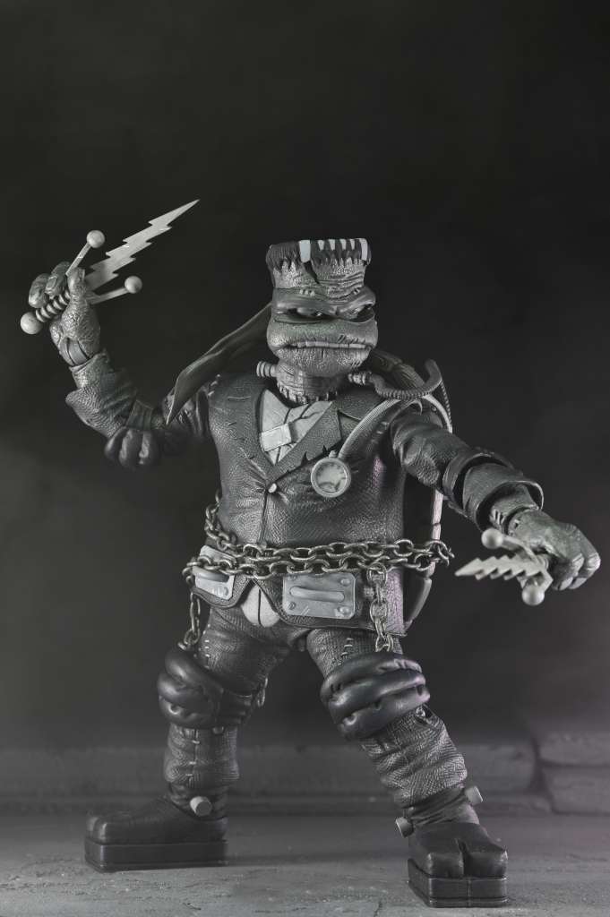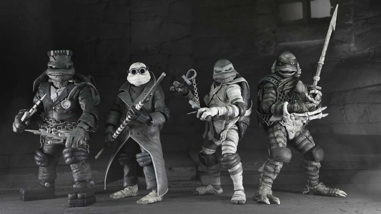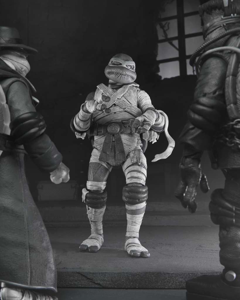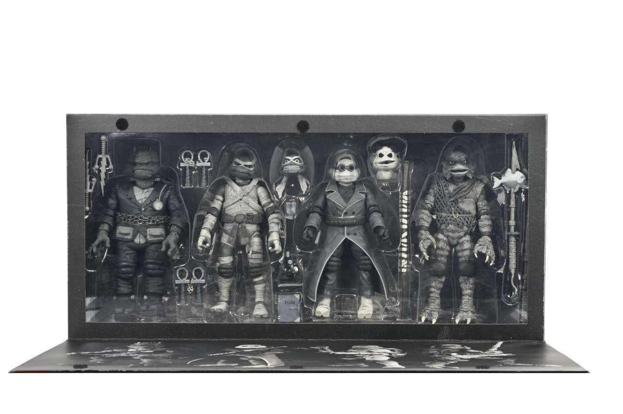 NECA is thrilled and chilled to introduce the next release in our Universal Monsters x Teenage Mutant Ninja Turtles action figure line! Paying tribute to the world’s most famous turtles and Universal’s icons of horror, this epic 4-pack reimagines the Heroes in a Half Shell as classic monsters in spine-tingling black-and-white deco. The 7-inch scale figures include Raphael as Frankenstein’s Monster, Michelangelo as The Mummy, Donatello as The Invisible Man, and Leonardo as the Creature from the Black Lagoon! These creepy creatures come fully loaded with all kinds of accessories, including extra hands, alternate heads, and weapons galore! Comes in collector-friendly window box packaging by legendary artist Daniel Horne.