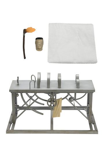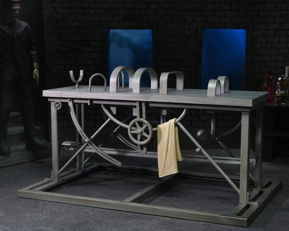 Build even bigger scenes and dioramas with this accessory set for NECA's Universal Monsters Frankenstein's Monster action figure! Accurate to the movie, the centerpiece of the set is the massive laboratory table, which measures over 9.5" inches long and over 6" wide and fits the NECA action figure (sold separately). The set also includes an additional bandaged head for the Monster, cloth, and a torch accessory. Closed box packaging.