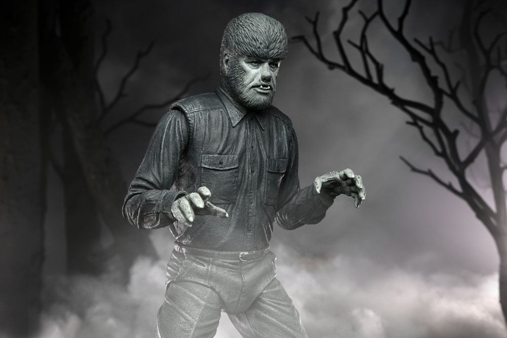 For the 80th anniversary of Universal's horror film classic, NECA is excited to reveal The Wolf Man in Ultimate action figure form! Starring Lon Chaney Jr., 1941's The Wolf Man is critically acclaimed for Chaney's moving performance and the special effects. The sculpt captures the human and monster sides of this complicated character with interchangeable heads, hands, and lower legs. The figure stands in 7" scale, features the authorized likeness of Lon Chaney Jr, and also includes wolf cane, animal trap and stand accessories. Presented in authentic black and white deco, like the original film. Display-friendly window box packaging with opening front flap.